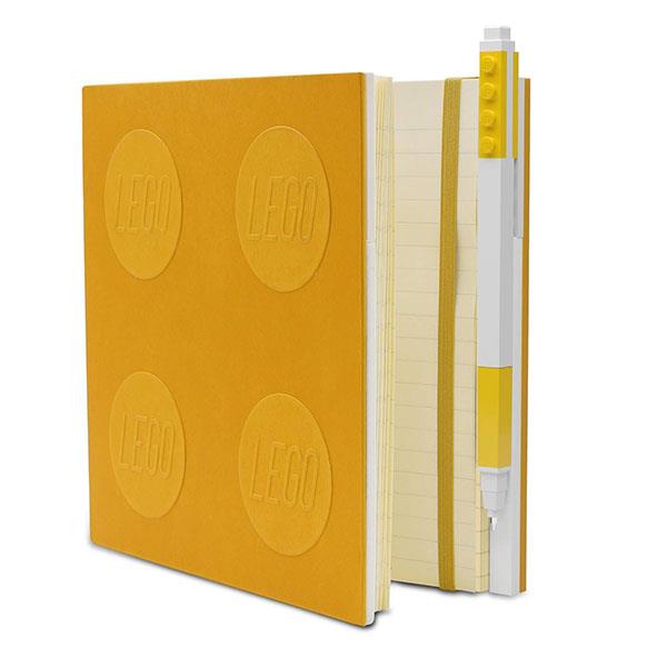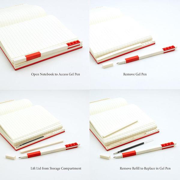 - Matching color gel pen clutched to LEGO® plates keep notebook and pen together