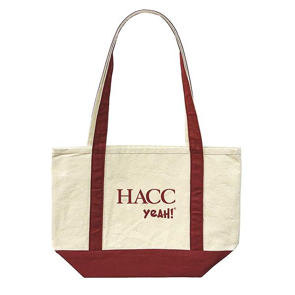 Natural canvas boat totebag with maroon bottom, straps, and HACC Logo imprint. Tote measures 18"L x 6"W x 13"H.